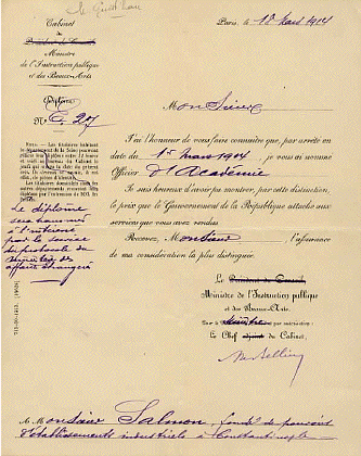 - Le 28 juin 1913, à son frère : J'ai reçu une lettre de Pichon adressée à Guist'hau dans laquelle il regrette de ne pouvoir me nommer conseiller du commerce extérieur à cause de mon âge, ce qui animerait des jalousies dans la colonie ; par contre il me promet les palmes. J'espère les avoir pour le 14 juillet. J'ai reçu de nombreuses félicitations à l'occasion de ma nomination aux EOB entre autre celle de Mr. Boppe, ministre plénipotentiaire, chargé d'affaires à l'ambassade.
