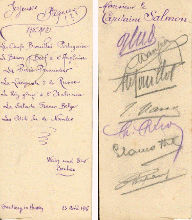 - Lettre N° 80 du 12 février 1916 : Pour les biscuits LU, je crois que pour l'instant 2 boîtes par mois suffiraient et je préviendrai plus tard s'il est nécessaire d'augmenter. Vous pouvez me faire envoyer encore du beurre de Rennes, il est mieux que j'aie une avance , et je vous préviendrai quand il faudra cesser. En général, vous pouvez forcer pour les expéditions pour que j'aie une bonne avance dans le cas où il y aurait une interruption. Envoyez-moi pour Pâques un oeuf de Pâques (en carton par exemple) contenant des bombons assortis, quelque chose d'assez grand pour 8 à 10 personnes de façon à servir de dessert. Le vin arrive très bien et vous pouvez continuer, c'est autorisé. Santé bonne. Je vous embrasse.