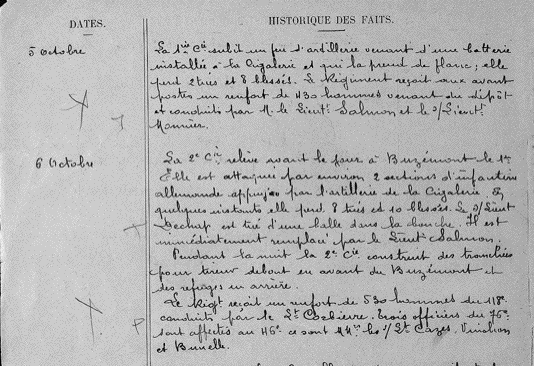 Etant compagnie de gauche du bataillon, et la liaison de ce côté avec le 76e d'infanterie n'étant pas immédiate, je dus, afin de protéger le Bataillon, et garder le chemin creux, placer une demie section au fond du ravin. Le restant de la compagnie , vu la conformité du terrain et les positions à défendre, étaient réparties sur deux faces. Le 7 janvier vers 7 heures du matin, les mines préparées par l'ennemi devant nos lignes sautèrent, et celui-ci passa à l'assaut; notre feu l'arrêta, mais quelques hommes avaient réussi à prendre pied dans des boyaux où nous travaillions en vue d'établir une tranchée parallèle. Je parvins moi-même à faire prisonniers 11 hommes qui y avaient pénétré et qui, immédiatement, furent dirigés sur le poste du Chef de bataillon. L'ennemi répéta ses assauts durant toute la journée, mais toujours il fut repoussé. Le soir la position de ma compagnie était la même, mais, à ma droite, un poste allemand avait réussi à s'établir dans une partie des lignes de la compagnie voisine. Le lendemain matin, 8 janvier, l'attaque recommença avec la même violence et la compagnie, dont le front n'avait pas bougé, résistait avec le même acharnement. Une partie de mes tranchées s'étant éboulée et comblée à la suite du bombardement de l'artillerie, ma compagnie fut coupée en deux. A ce moment, apprenant que le secteur gauche de ma compagnie se trouvait en danger d'être cernée par l'ennemi qui venait de foncer entre ma gauche et le 76e, je me dirigeai vers le fond du ravin afin de me rendre compte exactement de la situation lorsque, au tournant d'un boyau, je tombai tout-à-coup dans une patrouille ennemie. Dix minutes plus tard, je parvins à m'échapper et me diriger vers ma tranchée de départ où j'espérais retrouver une partie de ma compagnie, mais tous les hommes avaient été ramassés entre temps. Je fus, du reste, poursuivi par l'ennemi qui me recaptura